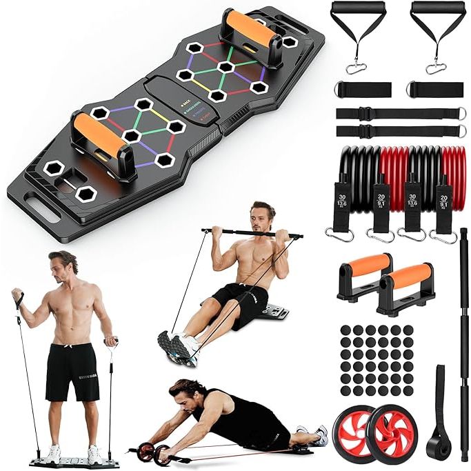 The Foldable Push Up Board is a 25-in-1 multifunction home workout equipment designed for upper body strength training. It features a portable push up board with color-coded variations and accessories for targeting different muscle groups including the chest, triceps, back, and arms. The board is foldable for easy storage and can be adjusted to different angles to suit your preferred workout intensity.