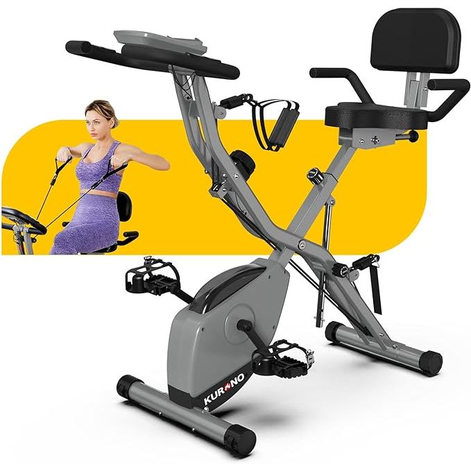 Experience a 4-in-1 exercise machine like no other with the KURONO Stationary Exercise Bike. Easily switch between upright cycling, recumbent biking, resistance training, and upper body strength exercises to create a well-rounded workout routine. Customize your fitness journey with 16 levels of magnetic resistance, accommodating all fitness levels and goals for continuous improvement and results.
