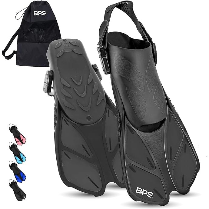 The BPS New Zealand Snorkel Fins are designed for travelers looking for a compact and versatile option for their water activities. These adjustable swim fins are open heel, making them suitable for adults and kids alike as they can easily be tightened or loosened to achieve the perfect fit. Made of durable materials, these fins are ideal for snorkeling, diving, and scuba diving.