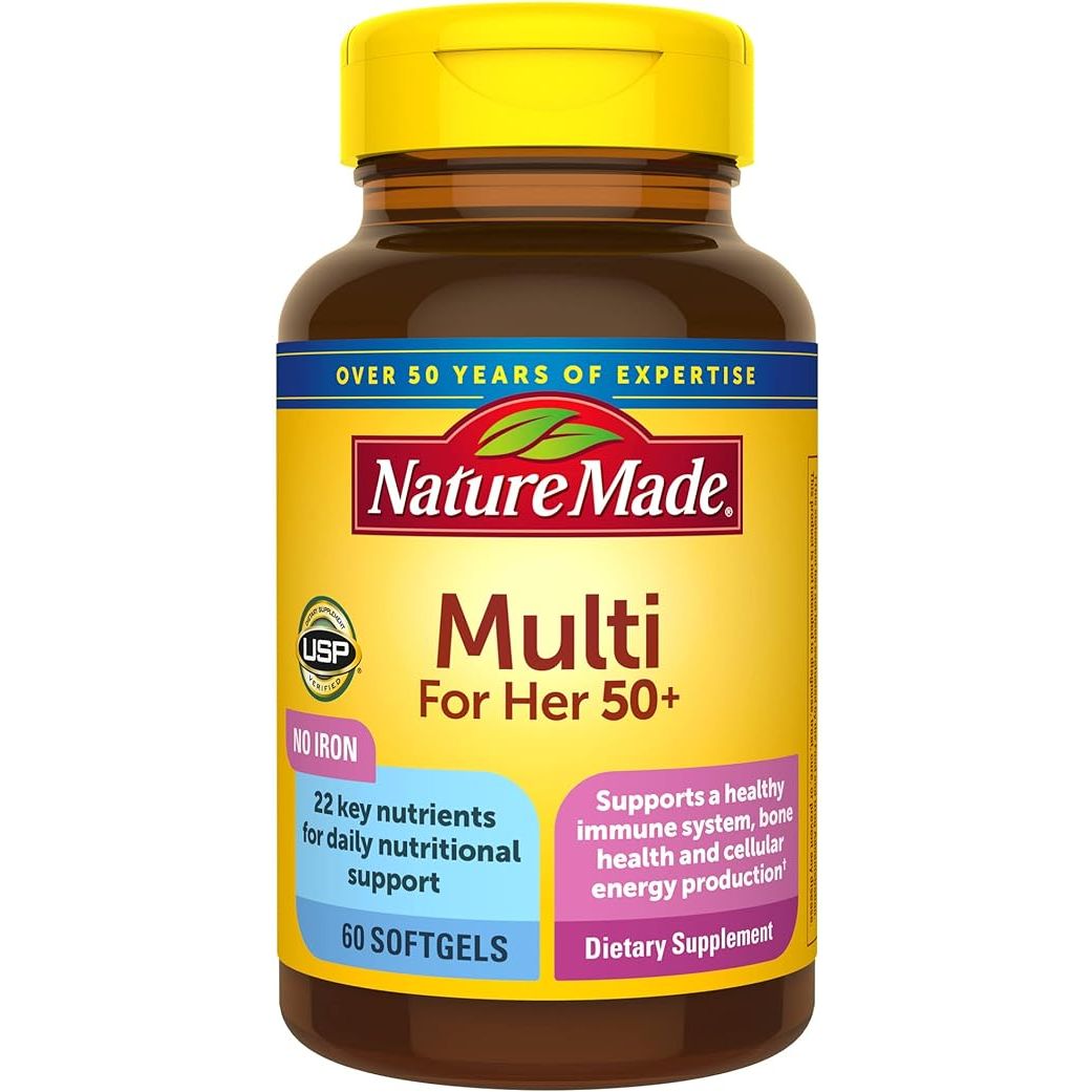 Discover Nature Made Multivitamin For Her 50 plus with No Iron Softgels, a tailored supplement for women 50 and older. Each bottle contains 60 softgels, providing a 60-day supply of essential nutrients to support your overall health. Formulated to enhance bone and muscle health, improve immune function, and boost energy metabolism, this supplement contains 22 vital nutrients including B vitamins, Vitamin A, C, D, and E.