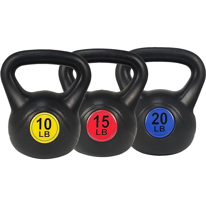 Introducing the versatile Set of 3 Kettlebells by Balance From, offering weights of 10, 15, and 20 pounds for a range of workout options. The ergonomic design of the kettlebells ensures a comfortable grip, making it easy to handle during exercises. Crafted from durable vinyl and filled with cement, these rust-free kettlebells are built to last for long-term use.