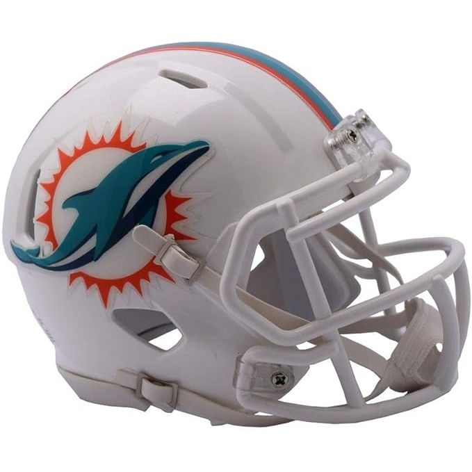 The Riddell NFL Miami Dolphins Unisex Replica Mini Speed Style helmet is a scaled-down version of the official helmet worn by players on the field. This mini helmet features the classic Miami Dolphins team colors and logo, making it a great addition to any fan's collection. It is designed with the same attention to detail as the full-size helmet, including a realistic facemask and chinstrap.