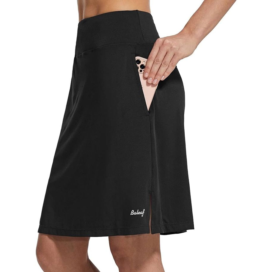 The BALEAF Women's 20" Golf Skirts are knee-length skorts designed for athletic and casual wear. These skorts are made with a blend of polyester and spandex, providing a comfortable and stretchy fit for easy movement while playing golf or engaging in other sports activities. The skirts feature built-in shorts underneath for added coverage and support.