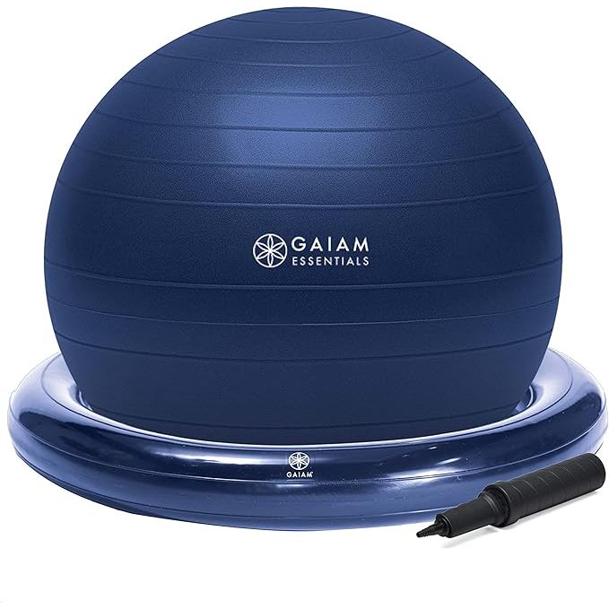 The Gaiam Essentials Balance Ball & Base Kit is a 65cm yoga ball chair designed for use at home or in the office. It comes with an inflatable ring base that provides stability and prevents the ball from rolling away while you sit or exercise. The kit also includes an air pump for easy inflation.