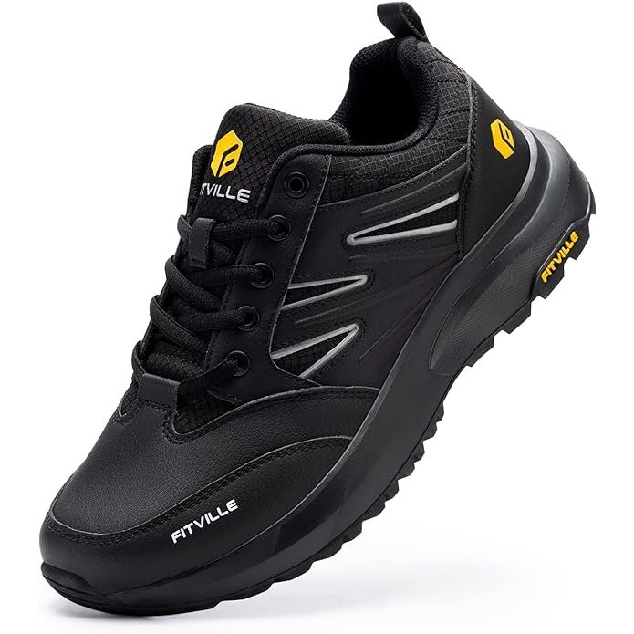 These hiking shoes feature arch support to provide maximum comfort and protection for your feet during long walks or hikes. The wide design ensures a secure and comfortable fit, while the sneakers' durable construction ensures longevity. Whether you're hitting the trails or working outdoors, FitVille Mens Wide Hiking Shoes are a reliable choice for all your outdoor adventures. Description by ChatGPT.