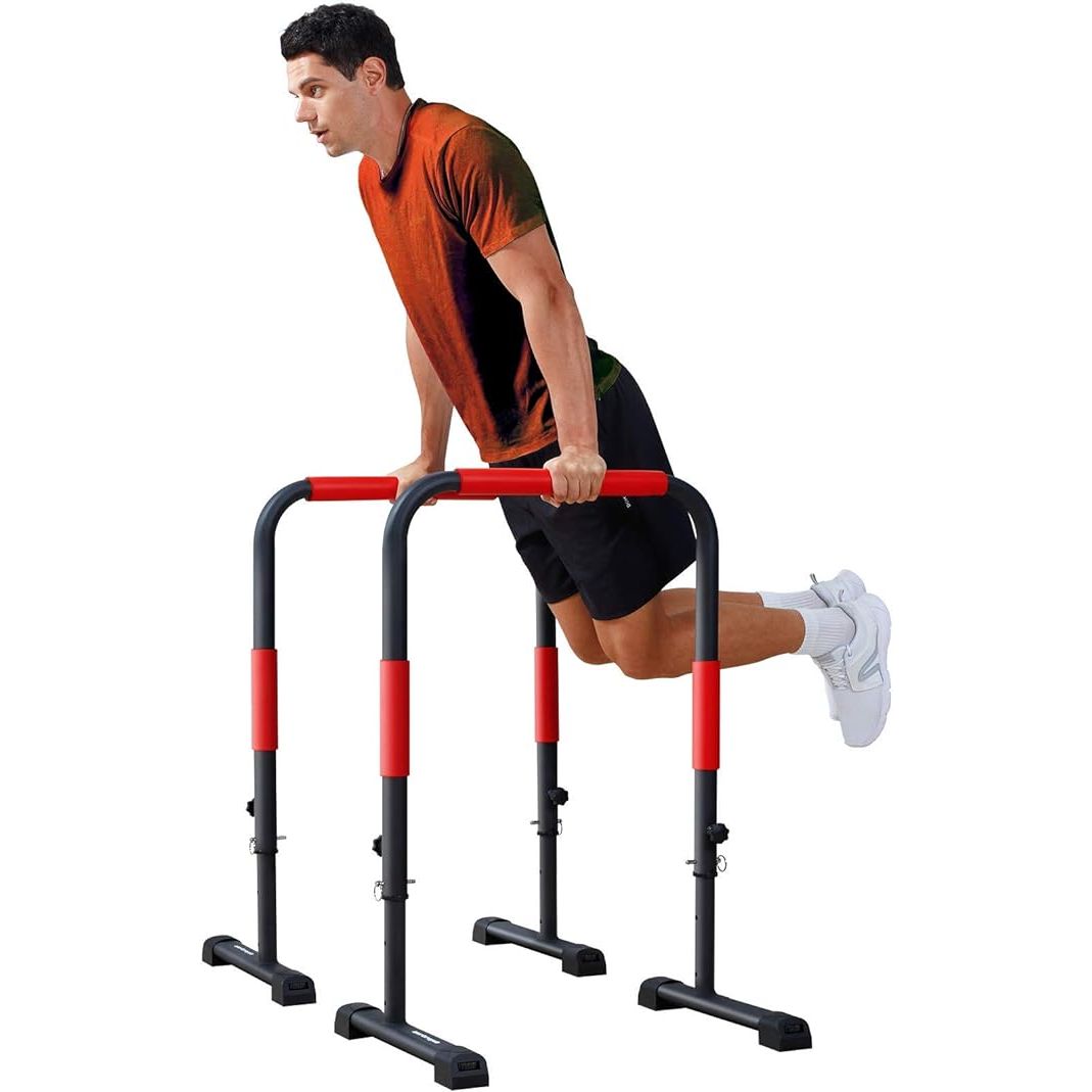 The Sportsroyals Dip Bars are an adjustable dip stand station designed for home use, calisthenics, and exercise. These portable parallel bars are made of thickened steel, ensuring stability and sturdiness during your workouts. With a loading capacity ranging from 300lbs to 1200lbs, these dip bars are suitable for users of varying strength levels.