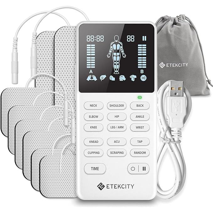 Introducing the Etekcity Clinical Strength TENS Muscle Stimulator, a drug-free pain relief solution that is both FSA eligible and FDA compliant. This innovative device helps manage pain issues and reduce muscle soreness caused by various conditions such as arthritis, joint pain, sports injuries, and more. With four channels and independent A/B channels, the Etekcity TENS unit allows for the use of up to 8 electrode pads, making it easier to target multiple areas for a more effective treatment.