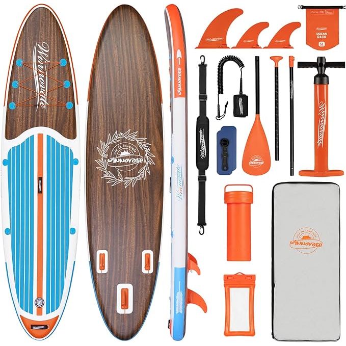In addition to the board itself, this package includes several paddle board accessories to enhance the overall experience. These accessories include an adjustable paddle, leash, hand pump for easy inflation, and a dry bag to keep personal items dry while paddling. The versatile design of the Winnovate paddle board makes it suitable for beginners and experienced paddlers alike, providing a fun and fulfilling experience on the water. Description by ChatGPT.